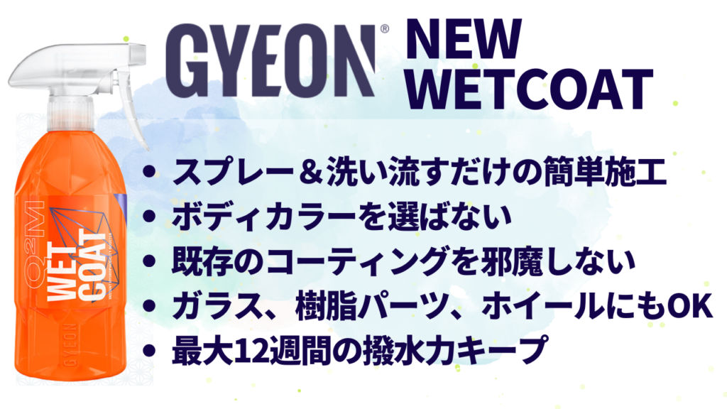 GYEON WET COAT is a protective agent that instantly forms a water-repellent film when sprayed on a wet car body after washing.