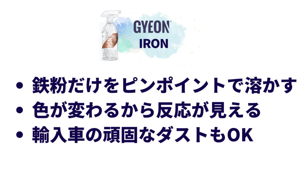 A major feature of GYEON IRON is that it safely dissolves and removes these iron particles through a chemical reaction, rather than physically scraping them off.