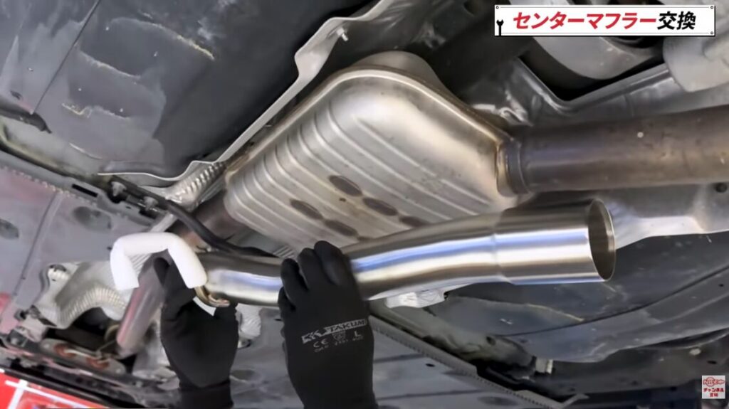 排気ラインの中央(センターパイプ)は、前段のエンジン側から後段のマフラーまでつながっており、その途中にレゾネーターやサイレンサーといった消音装置が設置されています。