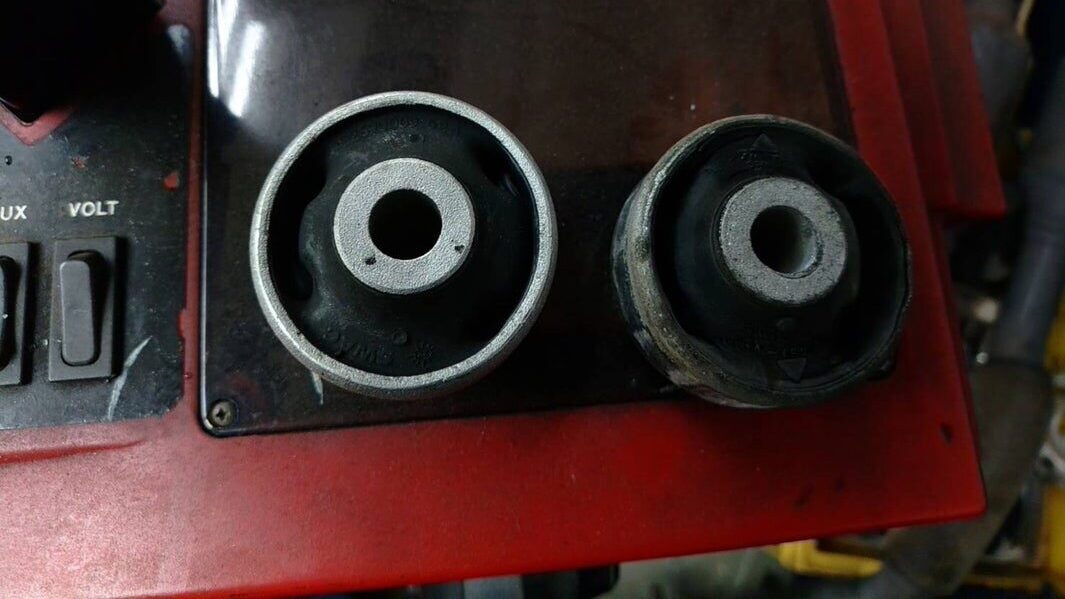 ロアアームブッシュは、サスペンションの下側を支える部品です。このブッシュもゴム製で、劣化すると動きに抵抗が出てギーッと音がするようになります。